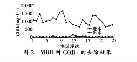 CODcr 去除機理:經UASB預處理后啤酒廢水的CODcr 平均可降低到1000mL左右。可降解有機物在MBR的好氧階段利用好氧菌的快速增殖降解功能被分解,一部分有機碳用于合成新細胞物質,其余部分被氧化成二氧化碳和水實現COD的去除。另外利用微濾膜的泥水分離作用,截留了一部分大分子有機物,也達到去除CODcr 的效果。