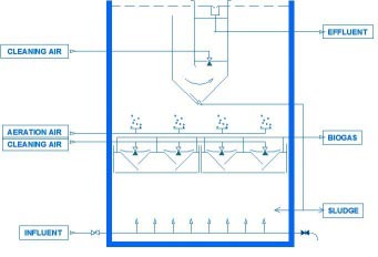 在反應器上部區域鼓入空氣以好氧降解剩余的COD。在反應器的上部裝有高效的分離器,它可以保證的澄清的出水,活性污泥留在反應器里,并且可以防止氣泡影響沉淀過程。