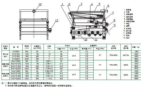 帶式濃縮壓濾機(DNDYQ型)是用于未經濃縮池的污泥的處理(如A/O法、SBR法的剩余污泥),與ZNDYQ型的濃縮結構不同,先期依靠濾帶重力脫水,適用更大的處理量。