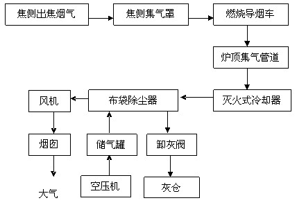 其中集氣大罩和地面站除塵設備的工藝基本都相同,集氣大罩安裝于攔焦車的導焦柵上方,用以收集推焦時產生的大量煙塵,地面站除塵設備一般由滅火式冷卻器、布袋除塵器、風機、電機和控制系統等幾部分組成。推焦煙氣治理主要由集氣干管和連接轉換裝置的不同可分為以下幾種工藝: