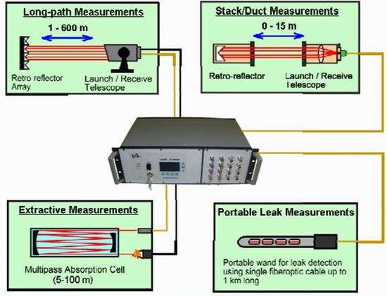 LasIRTM系統包括內置可調諧激光器的分析儀、發射激光光束并穿過被測介質的光學發射端、安裝在被測介質另一端接收透射光的接收端。分析控制器(分析儀)自身可以安置在遠離現場監測點1km之外的控制室內,現場光學傳感系統與分析控制器之間通過光纖和同軸電纜連接,測量的數據被保存在LasIRTM系統的分析控制器內的閃存卡或外部電腦上,外部電腦通過以太網網口或RS232端口與分析控制器連接,數據信息也可以傳送到企業的數據庫。