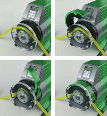 管座是為單手操作設計的,容易安裝,其設計依據是滑雪靴扣件的設計,這種管座使得膠管可以很各易從上部進行安裝。管座合攏即可對泵進行操作了。自行調整式的管夾意味著無需對膠管做進一步的固定。這樣的管夾形狀可以防止膠管在泵頭處扭結,從而延長軟管的壽命。