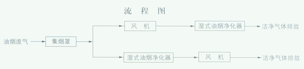 主要原理:油煙廢氣通過集煙罩和風機,引入濕式油煙凈化器,先經濾網過濾,再用加有處理劑的水進行噴淋洗滌,通過熱交換和吸附作用,使油煙廢氣得到冷卻和凈化。