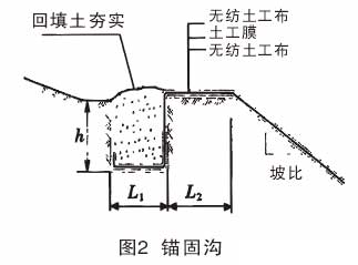 2)除利用材料與土之間的摩擦力外,為充分發揮密實填土作用下的抗拔力,在土工膜放置之前要按設計位置和寬度開挖錨固溝,同時在土工膜的施工鋪設過程中,必須按要求在坡面(或山坡)中間平臺和坡頂端末端收口處有一段水平伸出;并伸進錨固溝用壓密回填土覆蓋。見圖2