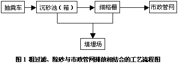 (1)在距污水廠較近的糞便接收站,由抽糞車將糞便從化糞池中抽出,運到接收站,僅采用粗固液分離和除砂設備,對糞便污水進行初級處理,處理后的過濾液,直接排放到污水處理廠的污水總進口處,與市政污水混合后進入污水的深度處理,分離出的大塊固體物送填埋場填埋。從而實現對糞便的無害處理。