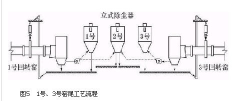 4)改造1號、2號、3號除塵器煙氣分流管道、風量調節閘板閥,3號窯的一部分廢氣分流到2號除塵器進行處理。這樣,相當于擴大了3號窯立式電除塵器收塵面積(原40m2增加為60m2),見圖5。