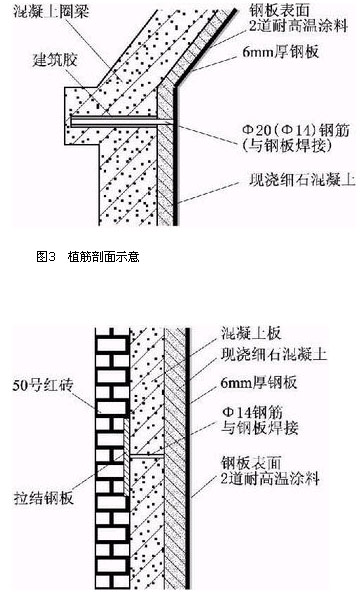 1)+21.595m混凝土結構采取內部表面處理,內植筋加固,內層鋼板焊接,鋼板與混凝土墻體之間采用拉鉚焊接,中間澆注細石混凝土,鋼板表面進行耐溫耐腐蝕涂料處理。植筋、拉結筋剖面見圖3、圖4。