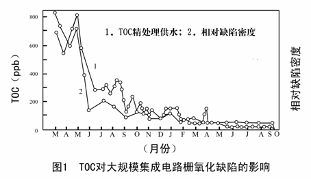 由于細菌及細菌內毒素都會產生顆粒性污染及TOC的污染,由圖1、圖2明顯看出顆粒性污染及TOC的污染對大規模集成電路的影響,因此在兆位電路用水中對TOC、細菌及細菌內毒素的含量要嚴格控制。